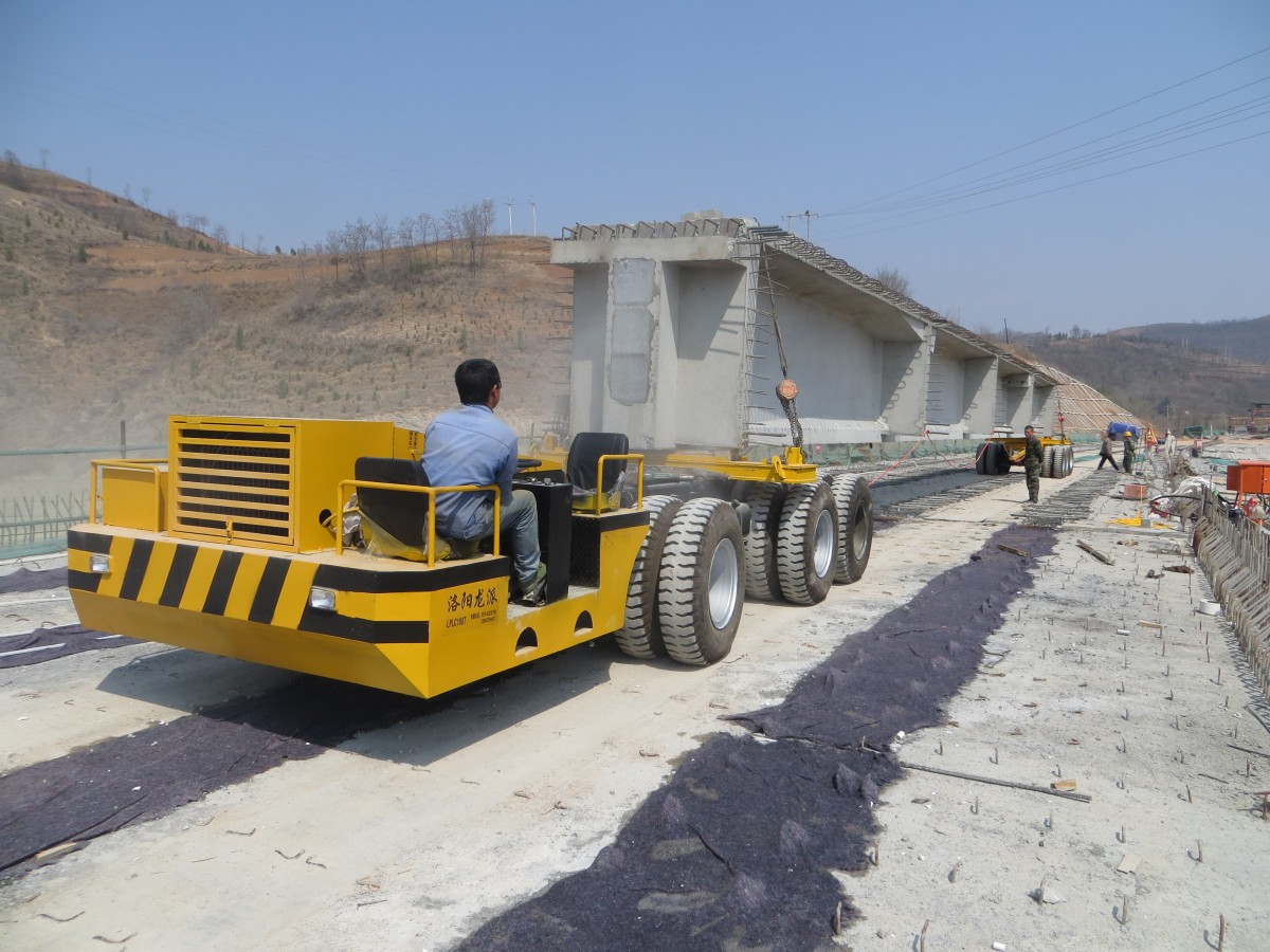 主要適用于預(yù)制梁場與架橋工地較遠(yuǎn),不適合鋪軌或鋪軌費用較高的場合。運梁車的剎車系統(tǒng)對縱坡有較大的適應(yīng)性。輪胎與地面摩擦阻力比軌道式運梁車有顯著的優(yōu)勢。